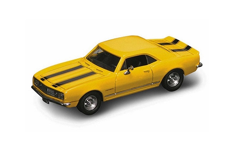 Iconic Chevrolet Camaro Z28. Striking yellow with black stripes. Diecast model with some plastic parts. Sealed body (no opening parts). Approx. 10.5cm x 4.5cm (4.25" x 1.75"). Comes mounted on a plastic plinth (No display case).