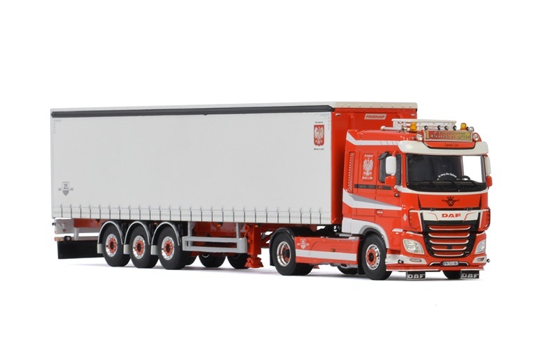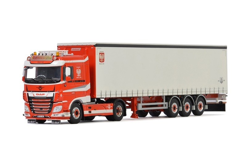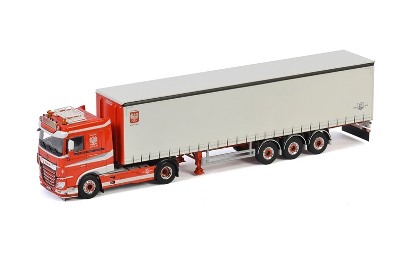 DAF XF Space Cab 4x2 tractor unit and 3-axle tautliner (curtain-side) trailer. Finished in Transports Bialek & Fils livery. Designed for use as a long-haul, heavy-duty, international transporter. The Space Cab provides ample room for two bunk beds, multiple storage compartments, HVAC, and a fridge. Diecast metal tractor with some plastic parts, and posable front wheels. Metal trailer with plastic upper. Overall size approx. 35cm x 8cm x 8.5cm (13.75” x 3” x 3.35”). FREE SHIPPING TO NZ ADDRESSES.